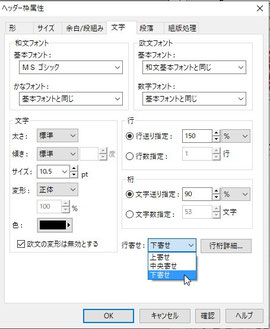 〔枠属性〕ボタンを押し、ダイアログの〔文字〕タブでフォント、サイズをヘッダーと同じ「MSゴシック」10・5ポイント、〔行寄せ〕→「下寄せ」に設定します。